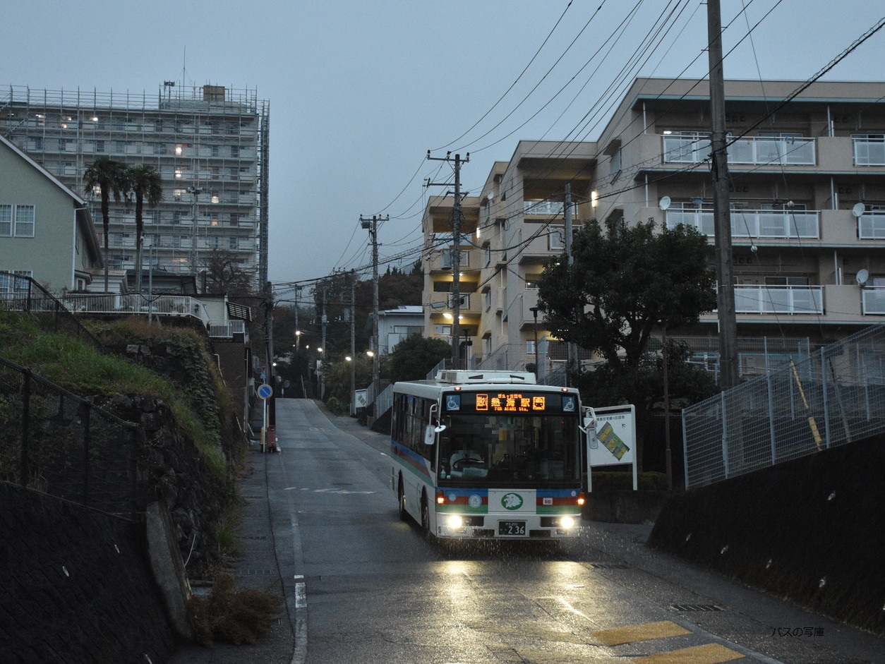 雨の笹良ヶ台団地の急坂を下る『236』 (2025年11月上旬撮影) |